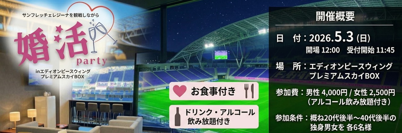 【5/3(日)開催】VIP席でスポーツ婚活!エディオンピースウィングでサンフレッチェレジーナを応援しよう | 2026/4/13 |