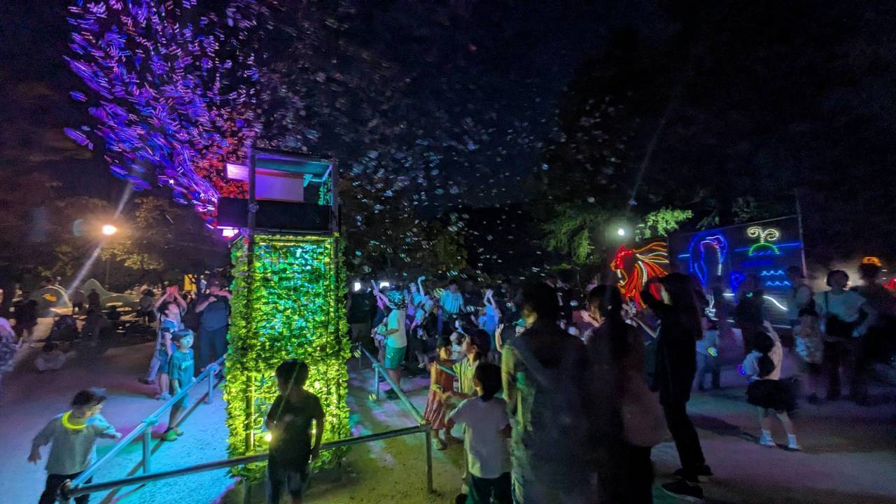 昨夜は安佐動物園のナイトサファリに、中学校からの親友家族と一緒に出かけてきました。夜の動物園は昼間とは全く違った表情を見せてくれて、イルミネーションの光とシャボン玉が幻想的な世界を演出していました。