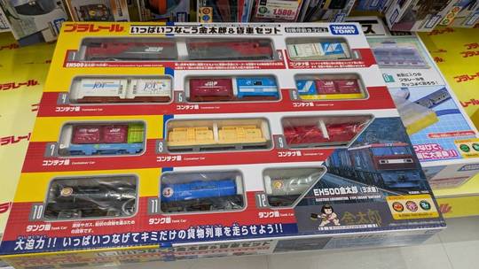 タカラトミーさんの**「いっぱいつなごう金太郎&貨物セット」**です。 (わかります。このズラリと並んだコンテナやタンク車…男の子のロマンが詰まってますよね…)