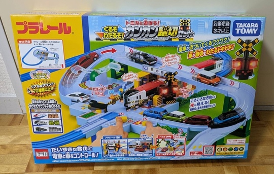 中身は大好きなプラレールのカンカン踏切セットでした。