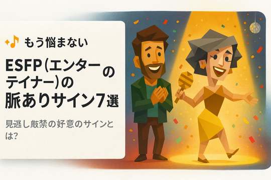 ESFP(エンターテイナー)の脈ありサインは、ストレートで、情熱的で、そして「君といる今が、最高に楽しい!」という喜びに満ちています。彼のパフォーマンスの裏にある一途な愛情に気づけば、毎日が祝祭のような、最高のパートナーシップを築けるでしょう。