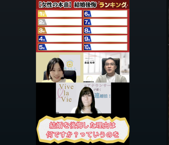 この動画では、既婚女性100人に聞いた「結婚を後悔した理由」のアンケート結果を、仲人たちがワイワイ予想しながらTOP10を当てていきます。
