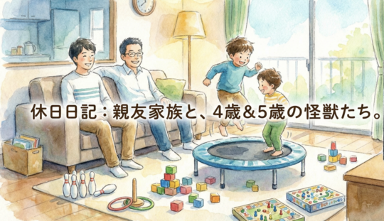 目的は、うちの4歳の息子と、親友の5歳の子供を遊ばせること。 男の子同士、家の中はもう大変です。 ブロックに輪投げ、トランポリン、ボウリング、そしてボードゲーム……。 これでもか!というくらいおもちゃを引っ張り出し、まさに「おもちゃのビュッフェ」状態(笑)。