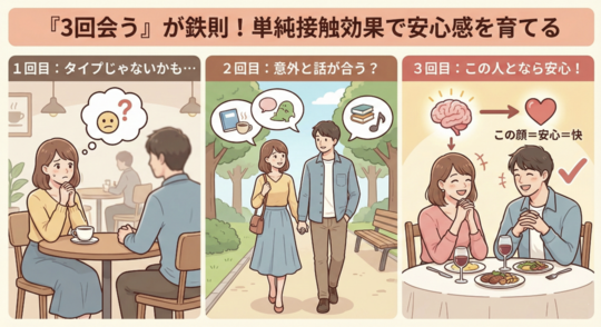 1回目は「顔がタイプじゃないな…」と思っても、 3回会って「私の話を否定せずに聞いてくれるな」「店員さんへの態度が素敵だな」というデータが集まると、不思議な現象が起きます。