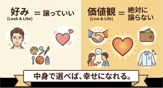 結婚において**「譲っていいもの」と「絶対に譲ってはいけないもの」**を分けることが、幸せへの近道です。