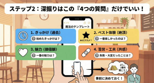 **「きっかけ」「一番の思い出」「魅力」**のどれかを聞く。