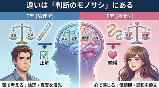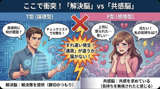 Fは**「気持ち」を無視されたと感じ、 Tは「親切」**を拒否されたと感じます。