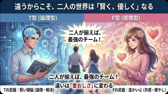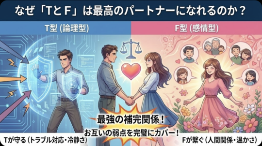 Fへの接し方(T→F): 正論を言う前に、まず「大変だったね」とサンドイッチする。 「共感(パン)」+「解決策(具)」+「共感(パン)」で挟むと、Fは美味しく食べてくれます。