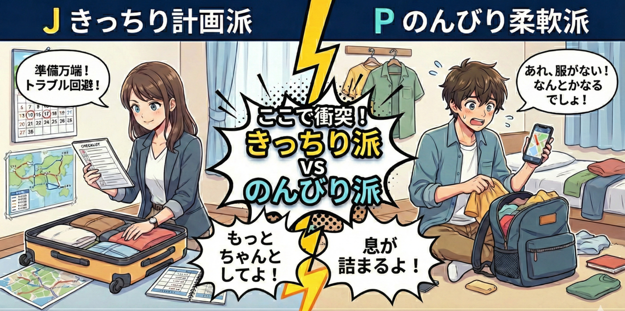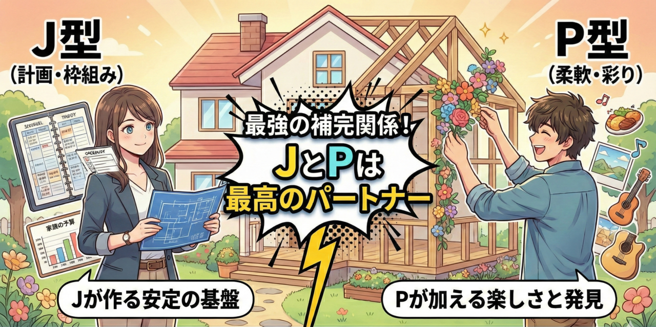 EとI(エネルギー)、SとN(視点)、TとF(判断基準)に続き、今回は、結婚生活において**「毎日の快適さ」**に直結する、 「J」と「P」の違いについてお話しします。