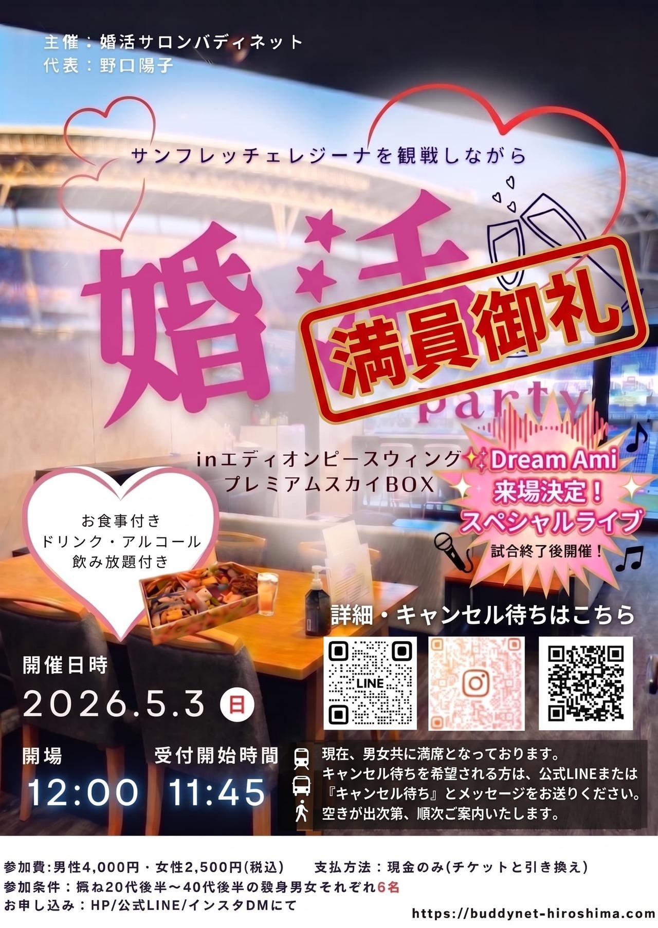 5/3(日)エディオンピースウィング広島のVIP席で開催するサッカー観戦パーティーは、ご好評につき男女満員御礼となりました!