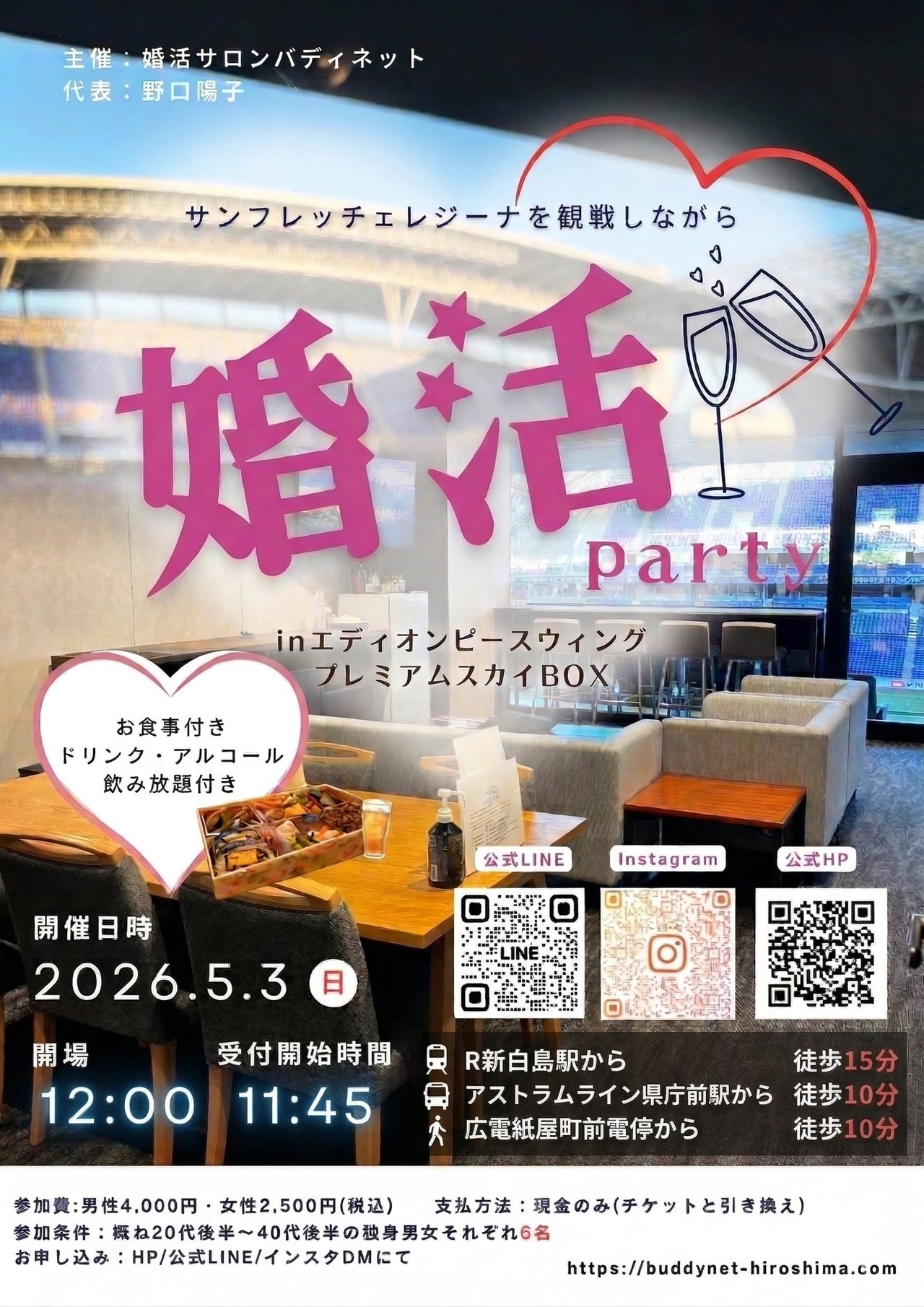 【女性枠のみ急募】5/3(日)エディオンピースウィングのVIP席で開催するスポーツ婚活パーティー!