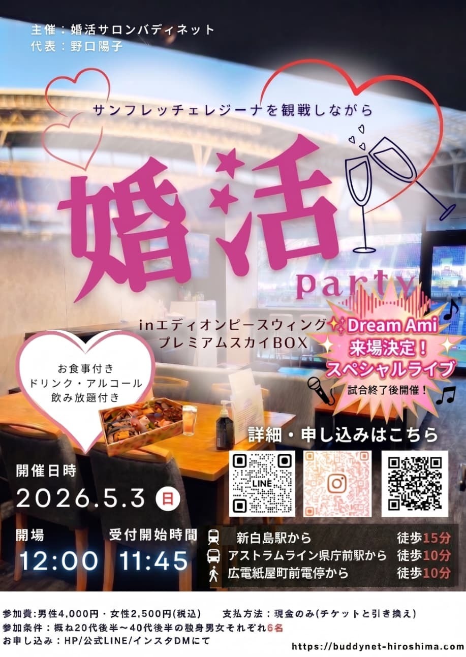 以前のブログで告知させていただいた、5月3日(日)開催の「エディオンピースウィング」VIPルームでのスポーツ婚活パーティー⚽️